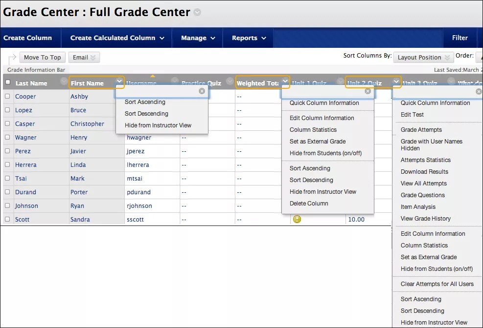 When you create or edit columns, you can select settings to display the data you want in the Grade Center. You also can hide and show columns, associate columns with categories and grading periods, and rearrange columns.