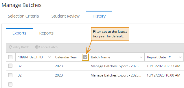 You can apply filters to other grid columns or clear the filter if you wish to view records from all tax years. The "Clear" filter option should also be used if no batches are displayed. The filter functionality is provided for the grids on the Exports and Reports sub-tabs. The UI retains the filter settings per user.