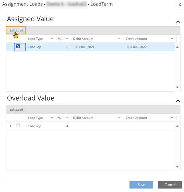If you try to add a fourth row, a message indicates that the load type cannot be split further. For example, You cannot further split the load since this Load Type is associated with only 2 GL codes.