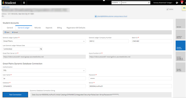 Anthology’s Cloud Services team must have completed the installation of additional components for your Azure environment to support communication between the Student Web App and Great Plains. This is done through a CSR (Client Service Request)