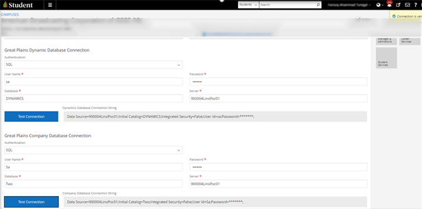 Select the Test Connection buttons to verify the Dynamics and Company connections. Once the connections are verified to be valid, the Great Plains integration is ready for use for the campus.