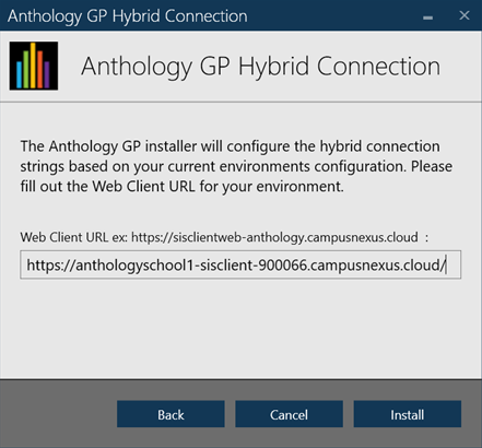 Select Install to start the installation process. If this installation is for your Test environment, then you must provide the Student Web App URL for your TEST environment.