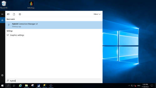In the Great Plains application server, search for “Hybrid”. Hybrid Connection Manager UI appears in the result.