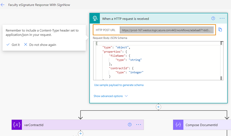{"AdminEmailId": "YouremailId-1@yourdomain.com; YouremailId-2@yourdomain.com","SignNowBaseUrl": "https://api.signnow.com","SignNowCallBackURL": "Callback URL"}Fields Actions AdminEmailIdSpecify the email Ids of the administrators who would receive flow success and failure notifications. SignNowBaseUrlSpecify the SignNow production URL. For example, https://api.signnow.com. SignNowCallBackURLThe Callback URL is taken from the Faculty eSignature Response With SignNow flow.