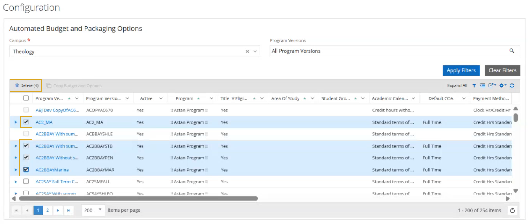 To delete a program version from the results grid, select that program version and select Delete in the toolbar. This resets the program version (if the program version has no area of study and/or student group) and removes all configurations (if the program version has no area of study and/or student group).