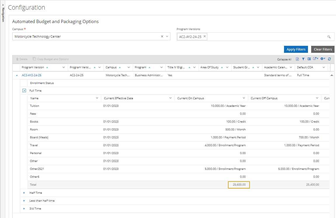 ) next to the program version to view a drop-down grid showing the specific details of that COA budget for that program version. Configured budgets are listed by their enrollment status (Full Time, Half Time, etc...). Select