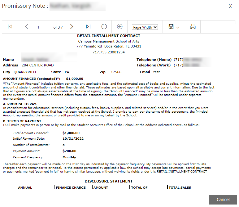 Select the Promissory Note button to view and print the promissory note for the student's payment schedule.