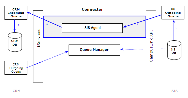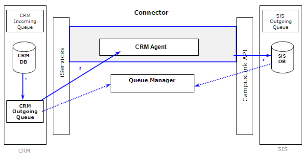When a record is created, or an existing one is updated or deleted in CampusNexus CRM, the transaction triggers the creation of an XML message in an Outgoing Queue. The Connector Service component’s Agent gets these messages from the CRM’s outgoing transaction queue through iServices and transforms them into the Student Information System (SIS) system (Anthology Student) format. After transformation, the relevant CampusLink API that is associated with Anthology Student processes the transaction to insert or update into the Anthology Student system.