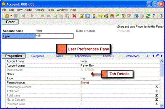 Apart from these tabs, the Business Administrator User can create tabs for the Account Object, and define Properties in the tab. Custom Properties can also be created for the Properties tab. You can view or hide the display of these tabs in the Account window.