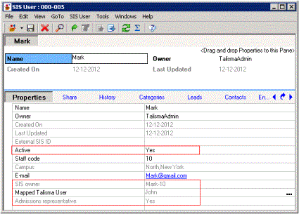 Example Mark is an SIS User created in Talisma and is mapped to a Talisma User John. The following graphic displays configurations of the SIS User, Mark: