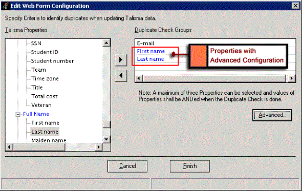 The Advanced Configuration field displays the Advanced Duplicate Check Criteria configured for Talisma Properties.