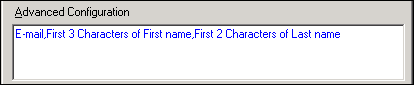 Note By default, the Advanced Configuration field displays Talisma Properties separated by a comma. For example, if the First name, Last name, and E-mail Properties are listed in the Talisma Properties area, the content in the Advanced Configurations field will be as follows: E-mail, First name, Last name |