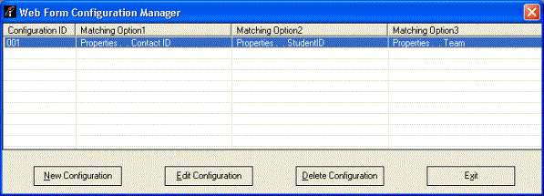 When you create a Configuration, the configured Properties are displayed in the Configuration ID, Matching Option1, Matching Option2 and Matching Option3 columns. The duplicate check is performed by using the Properties in these columns. Using this wizard, you can create, edit, or delete a Web Form Configuration.