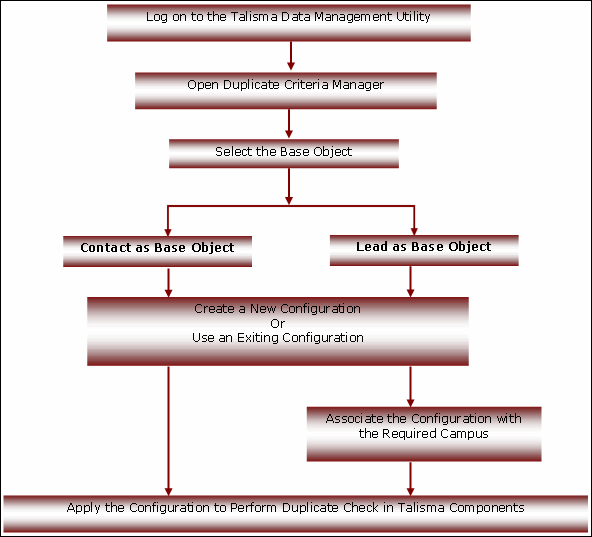 The following graphic depicts the process flow for working with the Duplicate Criteria Configuration option. See the table below the graphic for more information.