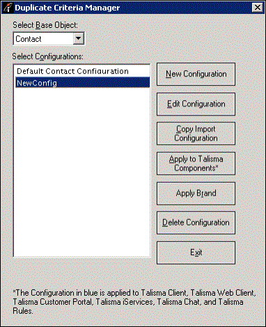 Note You can select Contact or Lead in the Select Base Object list. By default, the Contact Object is displayed in the list. For the selected Object, the Configuration for which the Apply to Talisma Components option is selected is listed in blue. If you select the Contact Object, the predefined Configuration for the Contact Object, Default Contact Configuration, is displayed in the Select Configurations area. |