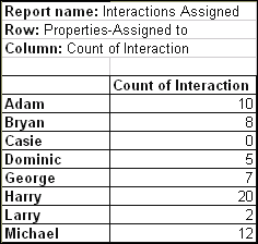 Example You want to find out the number of Interactions assigned to each User in the Customer Support Team. You can create a Cross Tab report using Interaction as the base Object and Assigned to as the Property defined along rows. Your report will look like this: