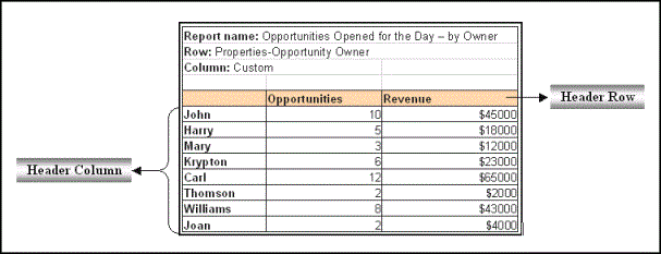 In the above example, columns are customized to display the count of Opportunities and their corresponding revenue. The column names Opportunities and Revenue represent the header row.