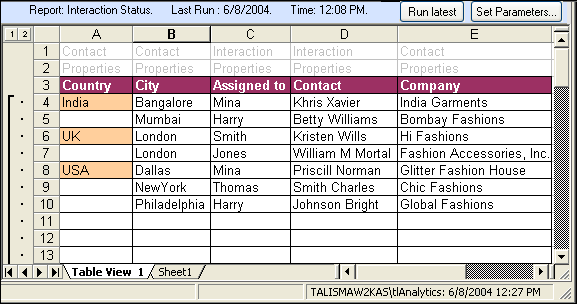 In this example, Interaction is the selected base Object, and Contact is its related Object. Properties of the Interaction Object such as State and Assigned to can be selected as parameters on which the report will be based. Similarly, Contact Properties such as Address-Country and Address-State can be plotted in the columns of the report. You can group the columns containing the Address-Country Property to get a country-wise breakdown of figures. Similarly, you can group by the state column and city column to drill down to lower levels. |