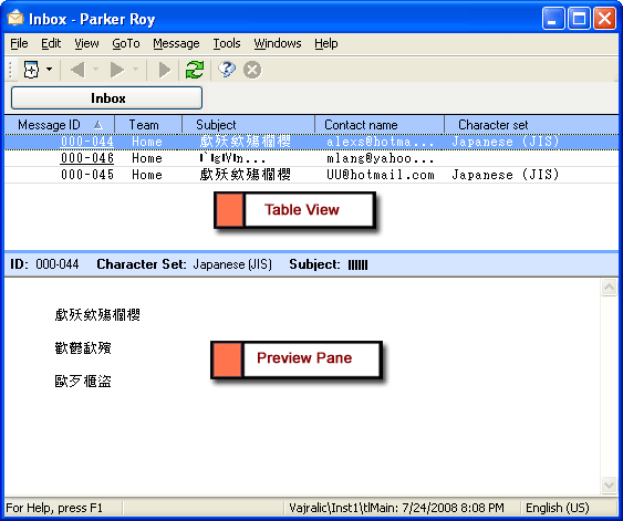 Displays the content of the incoming message selected in the Table View. The Header pane displays the Message ID, Character Set, and Subject of the Message. |