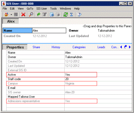 Example In Talisma Business Administrator the following configurations are performed: • For the Campus Virginia, Alex which is an SIS User in Talisma, is configured as the Default SIS User. • A User, Samantha, is created and is assigned to the Virginia Campus. Further, Samantha is not mapped to any SIS User. In Talisma Client, the following configuration is available for the SIS User, Alex:
