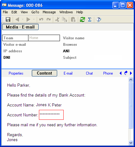 Parker Roy, the admissions representative at WorldWaves University, masks the value of the Account Number Property of Jones Mathew, a Lead who seeks admission at WorldWaves. The following image depicts the Account Number Property masked with asterisks (the special character) in the Message window: