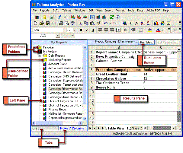 The My Reports pane (or the Left pane) lists all the reports (predefined and user-defined), and the Favorites folder to which you can add your frequently-used reports. It also lists the other predefined folders. The Results pane displays the selected report. If a selected report has not been run, the Results pane displays the message, "This report has not been run. Click Run Latest to run it." The report is displayed using Microsoft® Excel.