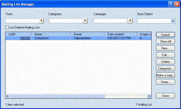 The Mailing List Manager enables you to locate, view, create, edit, share, and delete Mailing Lists. It also enables you to make a copy of the Mailing List and delete base Object items from a static Mailing List. To view the Mailing List Manager, select Mailing Lists from the Edit menu in any Workspace.