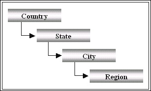 Example You want to track the number of Accounts with which your company transacts business. As your company's operations are spread across different states, you want a breakdown of the Accounts in each state, city, and region. You also want to know the name of the primary Contact associated with each Account. You can create a Drill Down report with Account as the base Object and Contact as its related Object. You can drill down on the count of Accounts from the country level to the regional level, which is diagrammatically represented below: