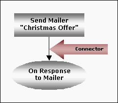 In a Workflow, Action Nodes are represented by rectangular boxes and Event Nodes appear as ellipses. Connectors are lines that join these Nodes. A sample is shown below: