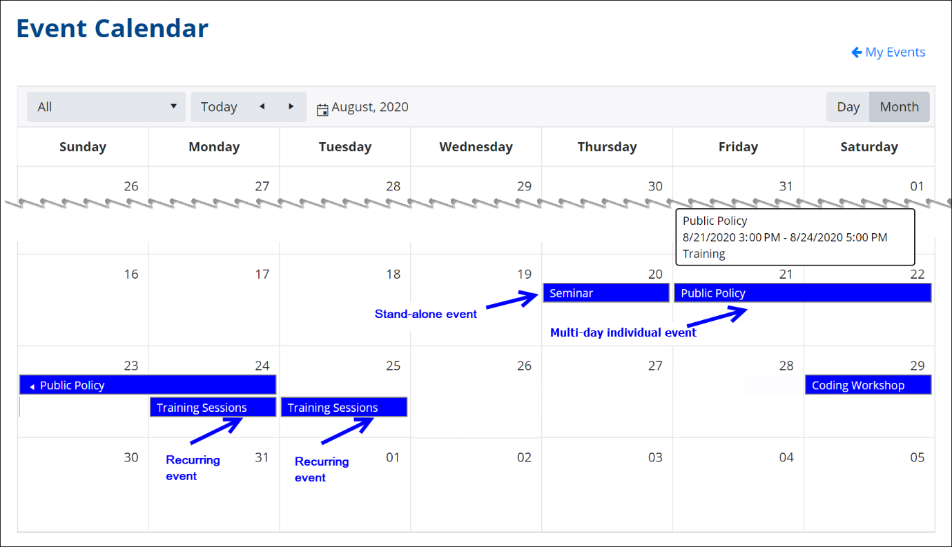 The Event Calendar page is an easy-to-view calendar of all the events (recurring and one-time events).