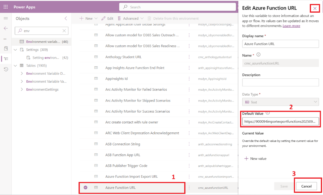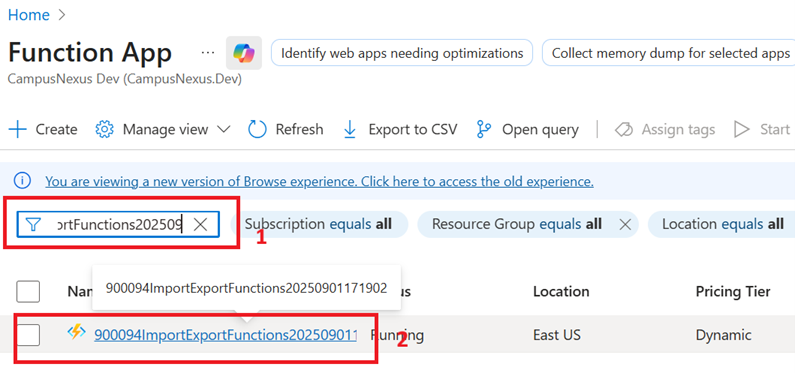 Obtain the Azure Function App name created for the Import and Export process