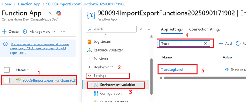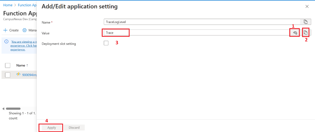 We will use this value to locate the Function App in the Azure portal in the Steps to Update the Log Level to Trace topic.