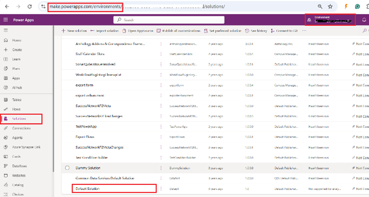 Select the required Reach environment and open the Default Solution by selecting Solutions on the left side of the page.