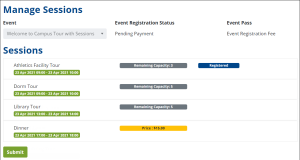Students can manage the registrations for the sessions or session tracks in an event from the Manage Sessions page. The Manage Sessions page can be viewed by clicking the View/Manage Sessions button in the My Events page.