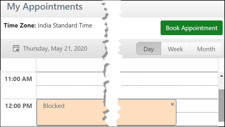 - If Mark as blocked is selected, the canceled appointment slot will be blocked and will be displayed as follows: