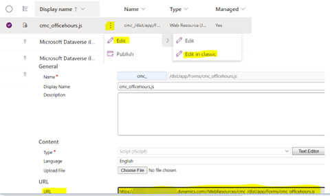 Select the three dots next to the cmc_officehours.js file and select Edit > Edit in classic.
