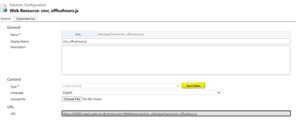Navigate to the Web resource: cmc_officehours.js browser tab and click the Text Editor button.