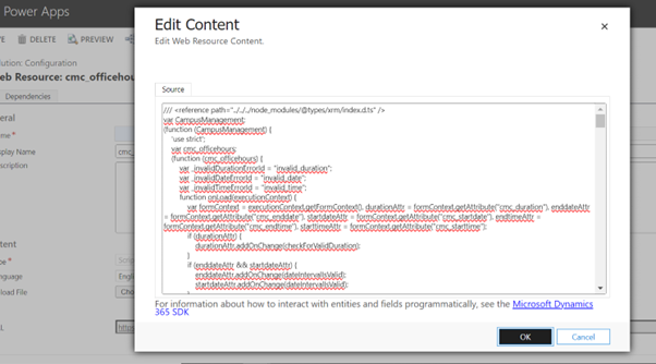 Copy the entire code from the code editor and paste it in the cmc_officehours.js content editor, and click OK.