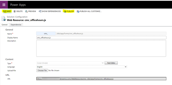 In the Add existing web resource dialog, search for, cmc_/dist/app/Forms/cmc_officehours.js file, and click Add.