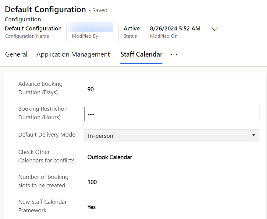 In the Default Configuration page, configure the following fields in the Staff Calendar tab: