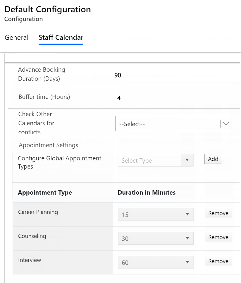 Default Configuration page (under Settings > Customization > Configurations) - In the Default Configuration page > Staff Calendar tab, the duration of the appointment types can be configured in the Appointment Settings section.
