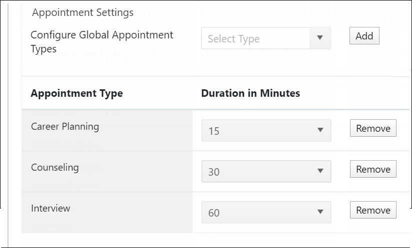 Appointment Types - Determine the duration an institution allots for specific kinds of appointments. For instance, the following time can be set in the indicated appointment types: