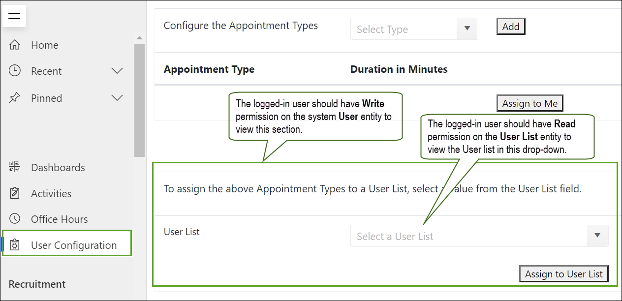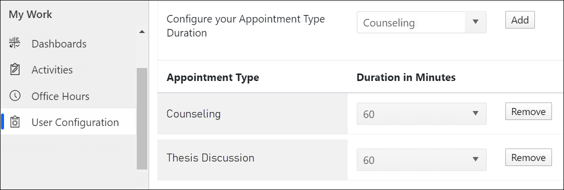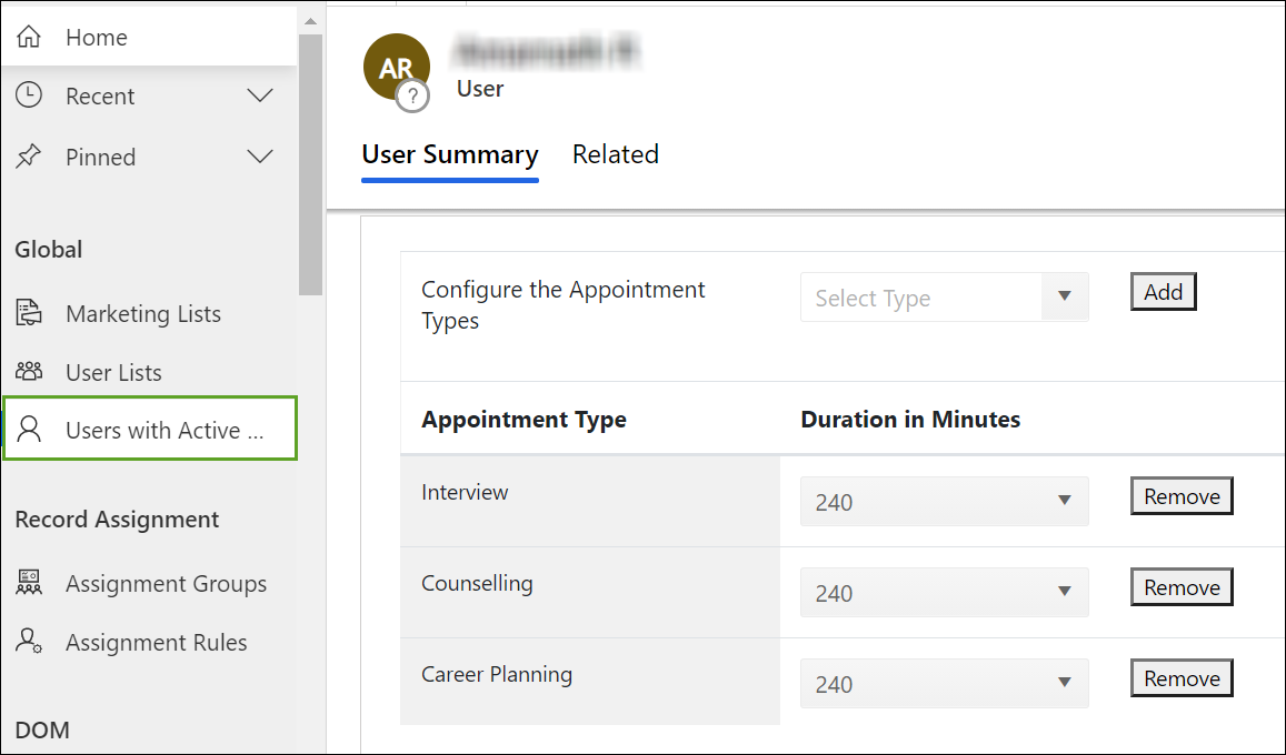 User Configurationpage (under Reach > My Work) - In the User Configuration page, the logged-in user can configure the duration of the Appointment Types. Further, if the logged-in user has Write permission on the system User entity, the user will also be able to configure the duration of the Appointment types for User lists.