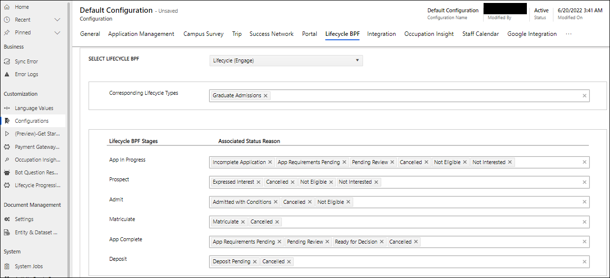 In the Lifecycle BPF tab of the Default Configuration page, map the new lifecycle status reason with Lifecycle Stages. This mapping must align with your institution’s business process.