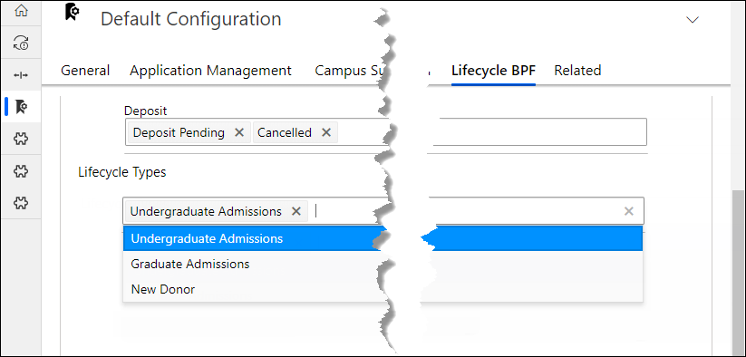 When a new BPF is created for the lifecycle entity, to enable its use, it must be mapped to a value of the Lifecycle Type field. This association happens in the Lifecycle BPF tab (the Lifecycle Types area) of the Default Configuration page.