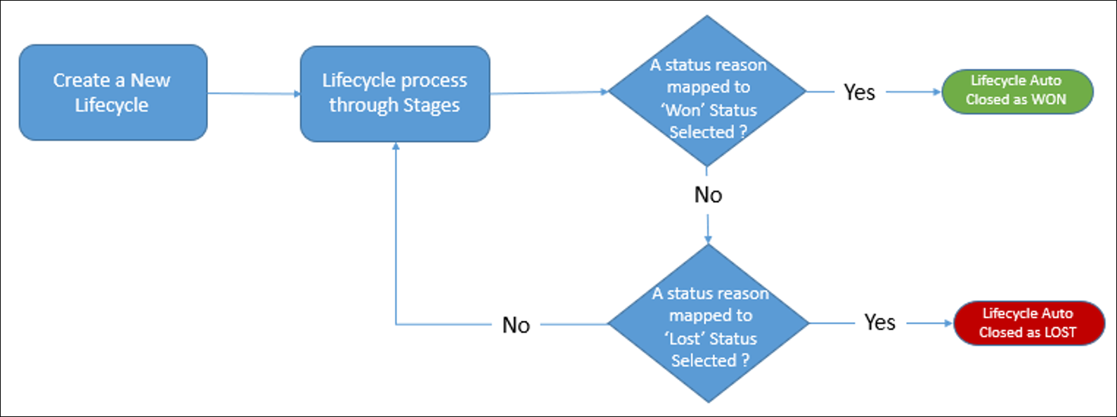 Values of the lifecycle status reason are associated with BPF stages and with one of the values of the overall lifecycle status (Open, Won, or Lost). This association is critical to an applicant’s progress through lifecycle stages and determines the value that is set in the lifecycle status when it is closed. The following diagram illustrates how a lifecycle is closed based on its status: