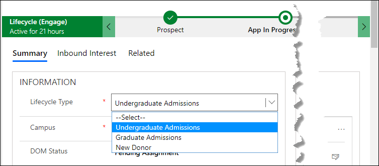 At a user level, the Lifecycle Type field determines the BPF that will be used. If a user working with the default BPF sets a value in the Lifecycle Type field that is associated with a custom BPF, the default BPF will be replaced with the custom BPF. This will occur after the user saves the lifecycle record.