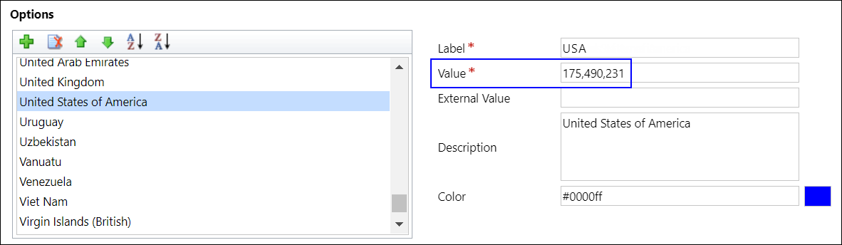 Example An institution requires that United States of America must be saved as the approved format even if the value retrieved is USA, or Great Britain must be saved instead of GBR. To enable this behavior the following mapping must be specified in this field: (“USA”:175490231, “GBR”: 120000435) This setting will ensure that even if the value retrieved is USA or GBR, values will be saved and displayed as United States of America or Great Britain because the retrieved values are mapped to the numeric database equivalent value of the approved format. Administrators can obtain a country’s numeric database equivalent value from the Value field in the Country global option set: |