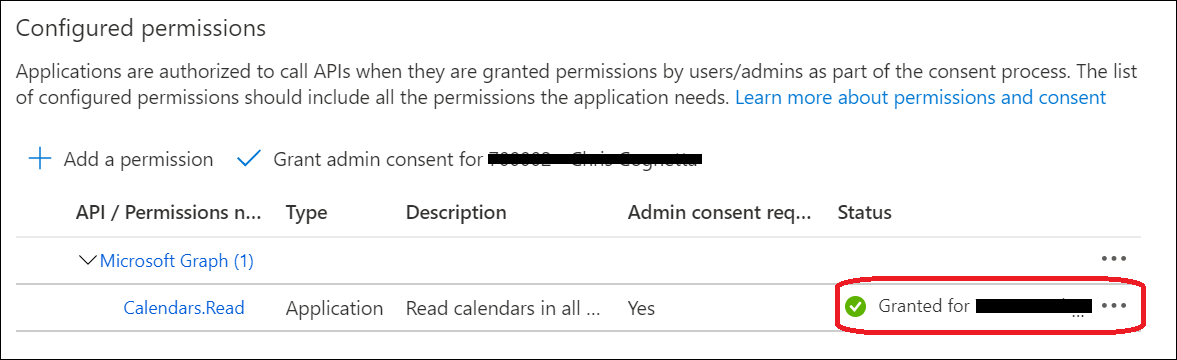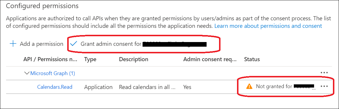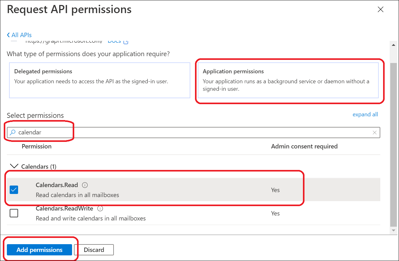 - Select Application permissions > Calendars.Read and then click Add permissions.