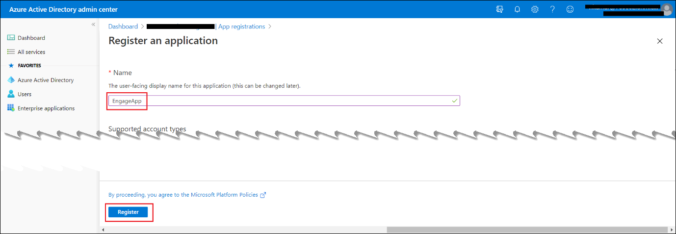 - Enter the name, for example EngageApp, and then click Register.